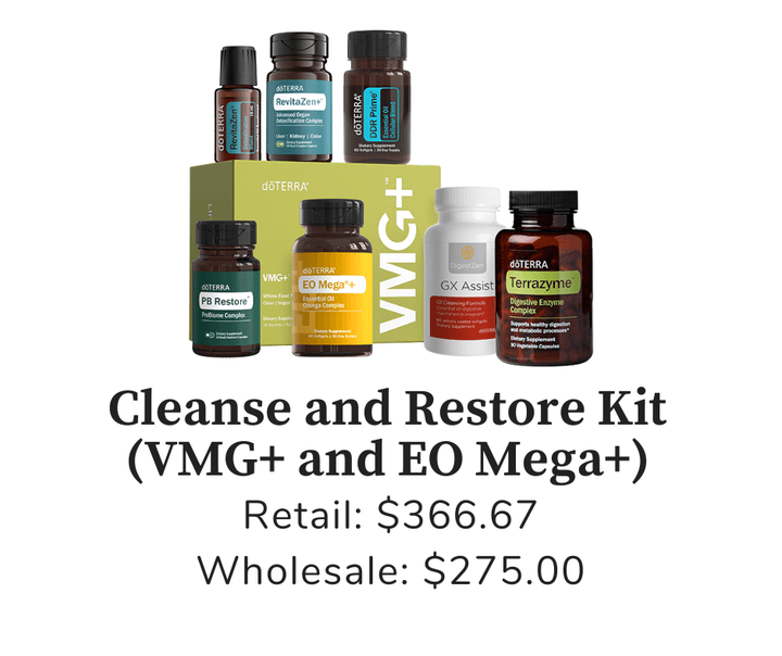 Deep Blue Rub®, doTERRA PB Restore ProBiome Complex, TerraZyme®, VMG+ Whole-Food Nutrient Complex, EO Mega+ Essential Oil Omega Complex